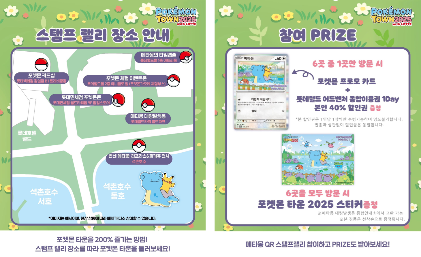 상품으로는 6곳 중 1곳만 방문시 포켓몬 카드와 롯데월드 하루 이용권과 할인권을 드립니다. 6곳을 모두 방문하면 포켓몬 타운 스티커를 드립니다!